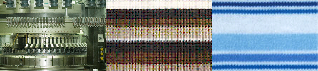 A double-stripe machine is a type of knitting machine that uses computer systems to knit using threads of different colors in desired length. It is possible to knit in eight different colors with this machine.